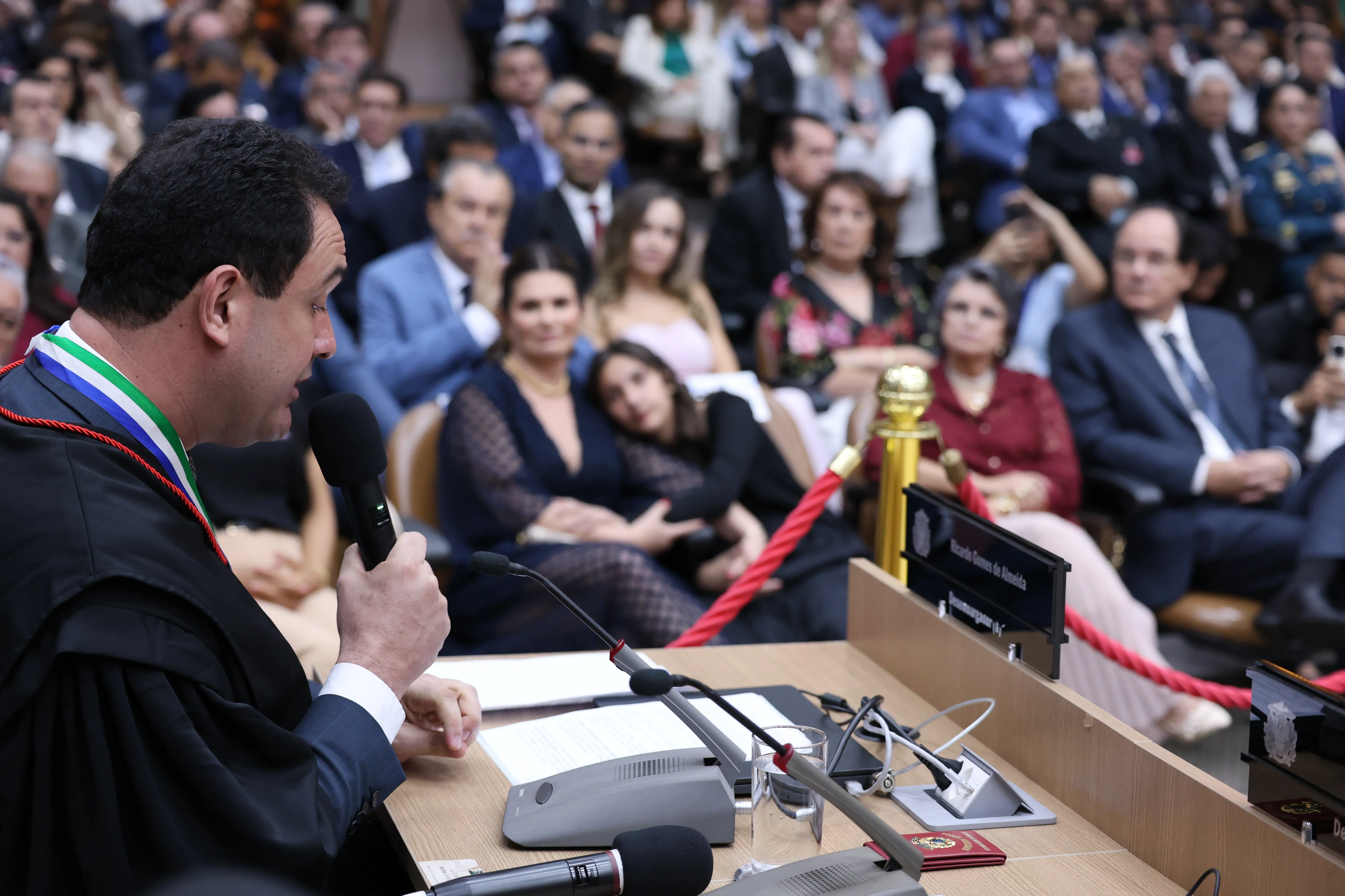O presidente do TJMT, desembargador José Zuquim Nogueira, conduziu a cerimônia e destacou, em seu discurso, a relevância da trajetória do novo integrante da Corte.